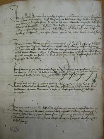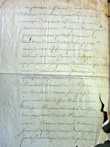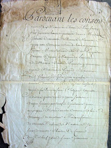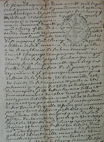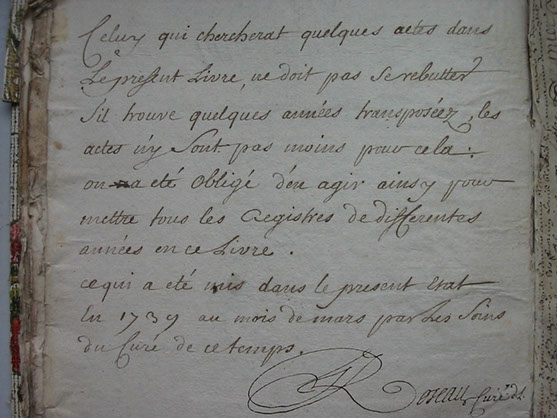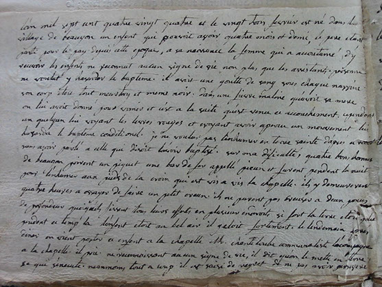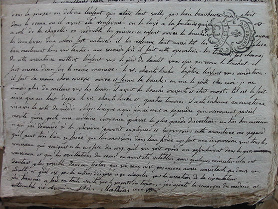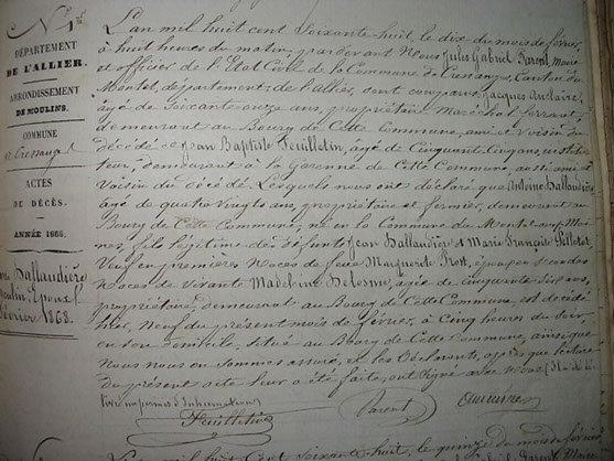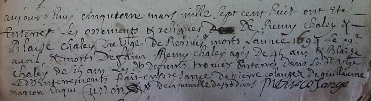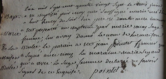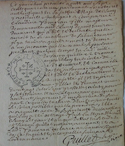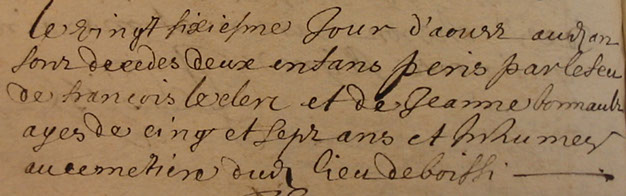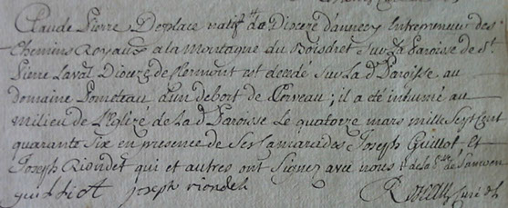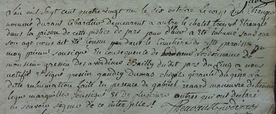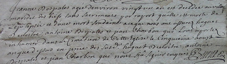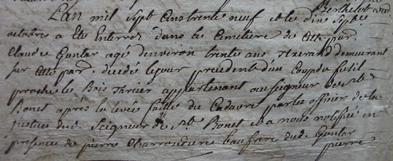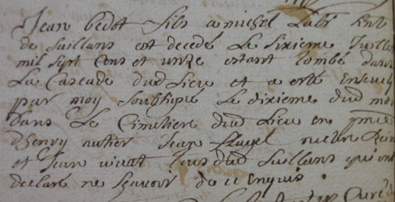Un jeune monsieur âgé de vingt cinq ans ou environ, bien facié, se nommant Bellecour, se disant originaire du côté de Nevers, et avoir son père et sa mère ; appres avoir passé quelques jours chez mrs Chamerlat au domaine de la Sagnie dans cette parroisse de Courpière, vint se promener en cette ville de Courpière le seizieme du présent mois d’aoust ; y coucha, et le lendemain dix septieme du dit mois, il reprit le chemin dudit lieu de la Sagnie. Environ deux heures appres midy en passant du côté de la croix de Mayet, et ayant fait environ cinq cent pas de ladite ville, il dit a sr Gilbert de Montmeau, qui l’accompagnoit, qu’il pouvoit s’en retourner, parcequ’il vouloit dormir, en effet ledit sr Bellecour se coucha sur du gazon prez d’une chenevière en allant à ladite croix de Mayet, et s’endormit ; quelque heure apprez le sr prieur Chamerlat vint le chercher à la ville, le sr de Montmeau le conduisit ou il l’avoit laissé et y étant, ils trouvèrent ledit sieur Bellecour mort ; son corps fut porté dans l’hopital de cette dite ville de Courpière ou il demeura exposé jusque au lendemain 18 quil fut conduit a l’église, et ensuitte enterré dans le cemetière de ladite parroisse en présence de Jean Chatagnier me charpentier, et de Simon Rahon me tallieur d’habits de ladite ville qui ont déclarés ne scavoir signer enquis.