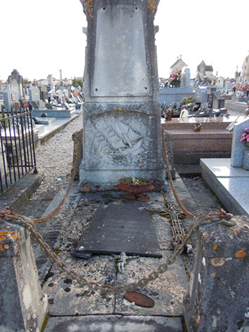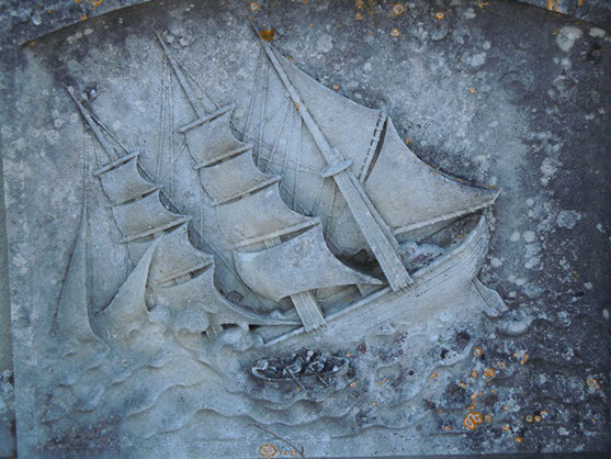 Une représentation, d’un navire trois-mâts à voiles qui coule dans la tempête et dont une barque avec deux hommes à bord s’en écarte, est sculptée ans la partie inférieure de la stèle.